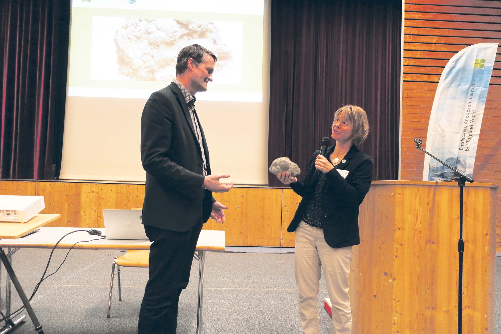 Am Ende dieses Abends, Anfang November in Oberbalm, steht Geschäftsführerin Lydia Plüss vorne, lächelt – und reicht ihrem Nachfolger Oliver Berger einen «Nagelfluh-Chemp»: ein Brocken aus unzähligen Steinchen, zusammengehalten von einem unscheinbaren Kitt. «So ist der Naturpark», sagt sie. «Die Steine sind gross, klein, verschiedenfarbig – so, wie die 19 Gemeinden auch. Allein sind die Steine nur Grien. Aber was es ausmacht, ist der Kitt. Das seid ihr, die Menschen, eure Bereitschaft. Das ‹verhäbt›, damit kann man bauen.»